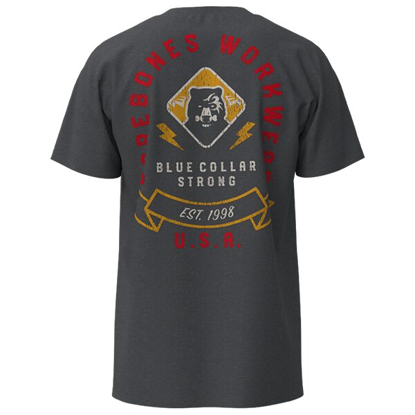 BareBones WorkWear(R) offers Blue Collar Strong Short Sleeve Tee, especially for proud blue-collar workers like you. Wear it proudly while you work comfortably with its lightweight, soft-blend, and durable makeup and cool graphic design at the back. It also proudly bears the BareBones printed logo on the front left chest and the brand label at the bottom hem.