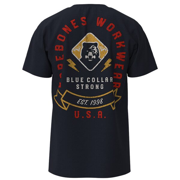 - Large graphic design at the back featuring the brand logo and ‘Blue Collar Strong’