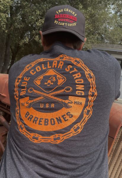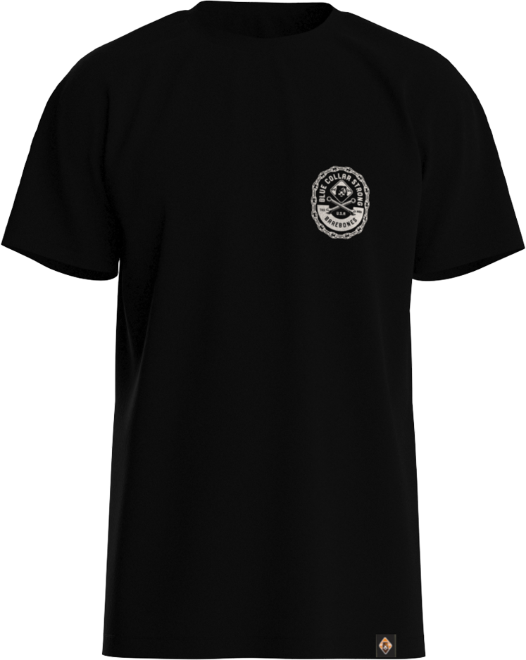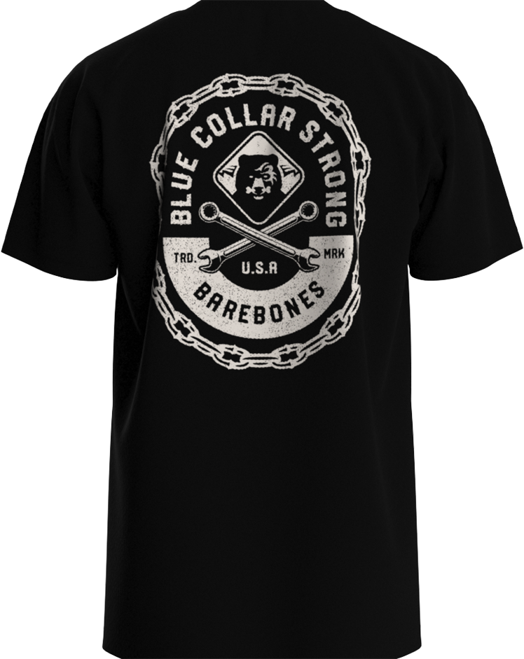 The Blue Collar Strong Wrenches & Chains by BareBones WorkWear(R) is designed to honor the grit and toughness of the person who wears it. It boasts a large graphic design on the back with a circle of chains and a picture of Barey with cross wrenchs. You know any BareBones apparel is all about durability and grit, so let your personality shine through. The shirt also bears the BareBones printed logo on the front left chest and brand label sewn at the hem.
