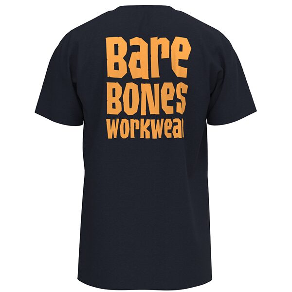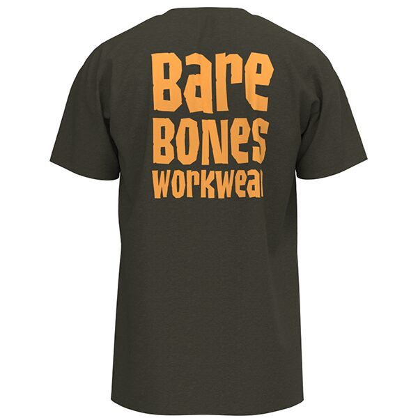 - Large ‘BareBones WorkWear’ graphic design in bright yellow gold at the back