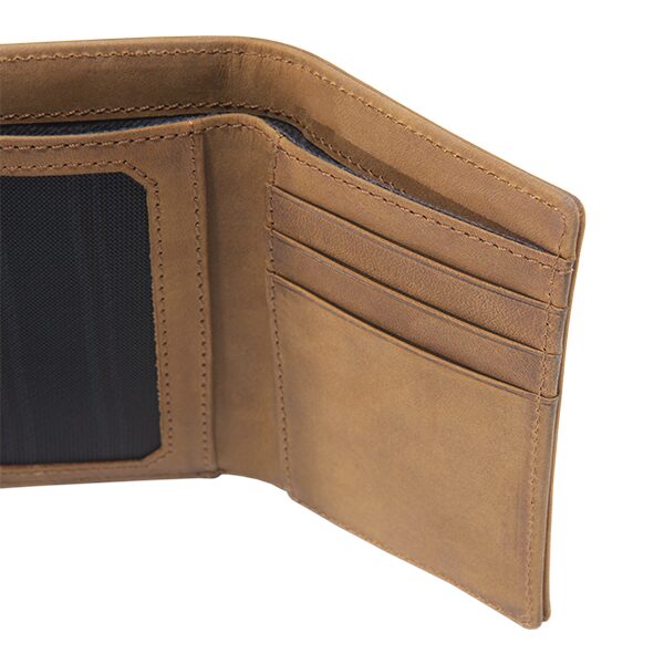 This Legacy Trifold Wallet from Carhartt comes with an ID window to keep your identification card handy for a quick inspection. This durable wallet is made from full-grain leather with cotton duck billfold lining. It has a slick simple design with stitched details and the woven Carhartt label on the front. Aside from the ID window, this trifold wallet also has 6 card pockets, 2 side pockets, and a billfold. It also comes in a collectible Carhartt tin.