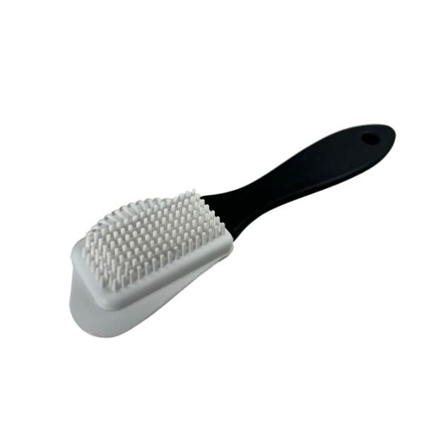 Four Seasons German Suede Combo Shoe Brush comes on one side with rubber bristles and the other side with a combination of wire and nylon bristles. It also has raised grooved edges. The rough rubber surface can remove heavy scuff marks or stains while the brass and nylon bristle can gently groom and clean the nap. The arched rubber surface can be used to clean rounded edges while the thin rubber edge can be used for hard-to-reach groves and creases.