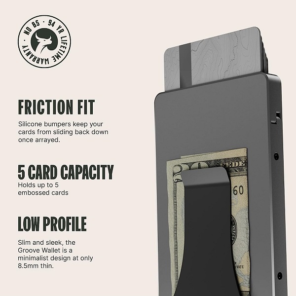 The Groove Wallet® is built to protect your stuff and outlast the competition. It includes RFID-blocking technology for extra security and holds up to six (6) cards while maintaining a low profile. Also comes with a detachable money clip. Say hello to the baddest, thinnest wallet in its class.