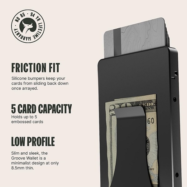 The Groove Wallet® is built to protect your stuff and outlast the competition. It includes RFID-blocking technology for extra security and holds up to six (6) cards while maintaining a low profile. Also comes with a detachable money clip. Say hello to the baddest, thinnest wallet in its class.