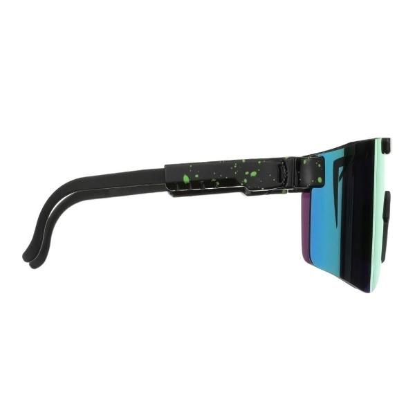 • Boxy shape with dark polarized mirror lens in a black frame with neon green splatter, screams retro vibe, allowing for easy and cool styling