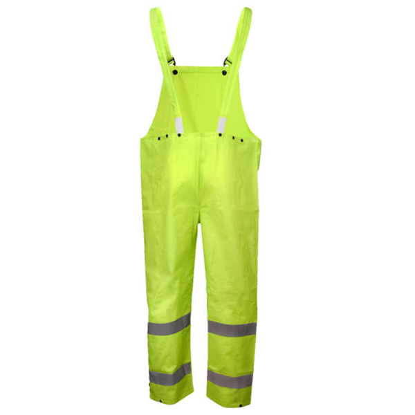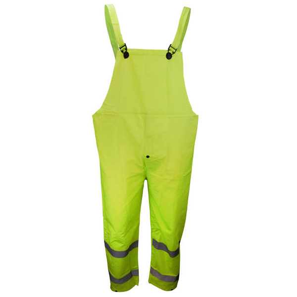 Econo-Viz Bib Trouser with Safety Fly and Reflective Tape is made from .35mm PVC coated Polyester knit and constructed with seams that is electronically welded to ensure its waterproof ability. It also comes with elastic and adjustable suspenders which allow for a comfortable customizable fit. Perfect when you need to wear this bib trouser for extended periods. It also has take-up snaps on the backside of the waist, a safety fly, and plastic take-up snaps on the leg cuffs. In addition to its high visibility lime color, it also features 2 inches of silver reflective tapes on both legs to further boost visibility particularly when working in low-light conditions.