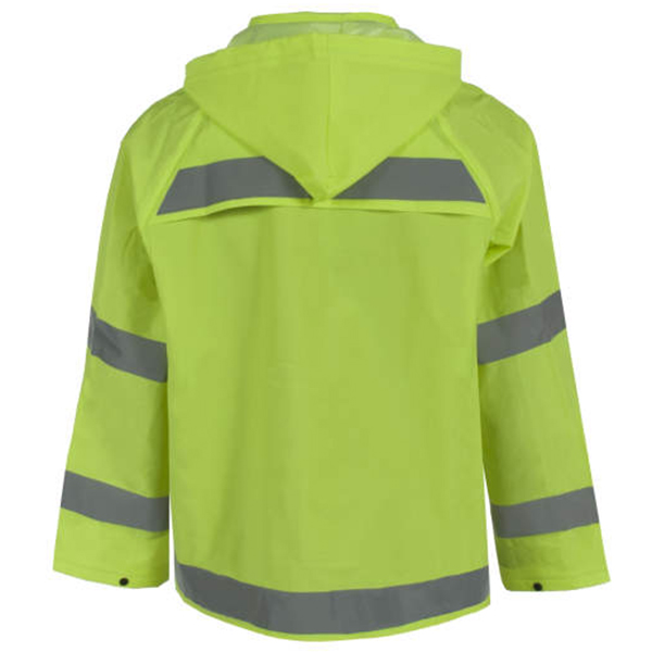 Econo-Viz Jacket with Snap-On Hood and Reflective Tape is made using .35mm PVC coated Polyester knit with electronically welded seams to ensure it’s 100% waterproof. Aside from its high visibility lime color it also features a 2-inch silver reflective tape on the body and sleeves to further improve visibility particularly when working in low-light conditions. Its detachable hood also comes with a drawstring that you can easily adjust if you need added protection from the elements. It also has underarm vents and a vented back to support air circulation so you stay cool and comfortable while working hard. It also features a snap front closure with a storm flap and sleeves with take-up snaps to block the rain and the wind. A couple of side slash-through pockets are also fixed on the jacket so you can easily reach into your original clothing without a fuss.