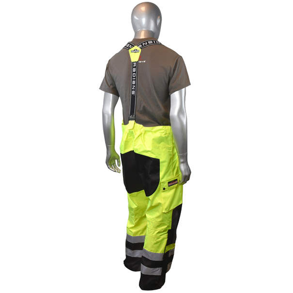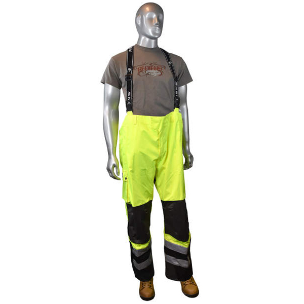 This RadWear Heavy Duty Ripstop Rain Bib Pants is built to withstand rugged usage in challenging weather with its 300 Danier Ripstop Oxford with waterproof and breathable PU coating makeup. It also has reinforcements in high-stress areas; like the seat, knees, and pant cuffs, using Aramid fabric to strengthen it and support its durability and abrasion resistance. Just the kind of protective pants you need if you are a construction worker, nighttime worker, airline personnel, or roadway & temporary traffic controller.