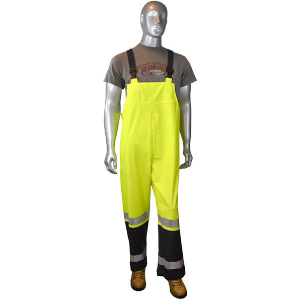 RadWear High Visibility Rainwear Bib Overall is built ready for rugged use with its double heat-welded construction which strengthens and boosts its overall durability. Â It also features a 2-inch silver reflective tape on both legs for enhanced visibility and protection when working in low-light conditions like during a downpour, gloomy weather, and late night or early morning duties.