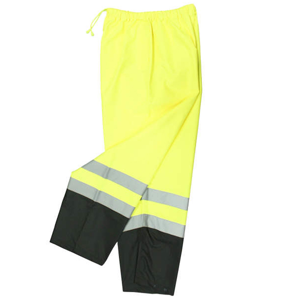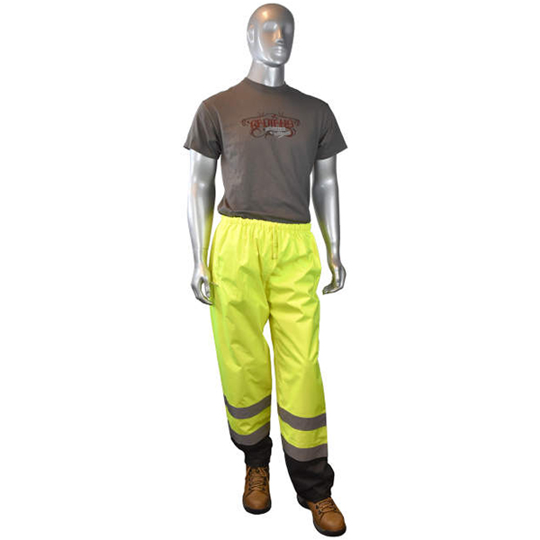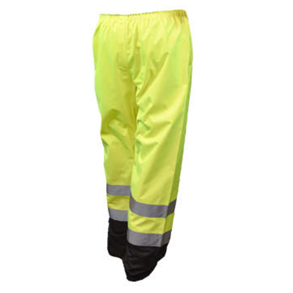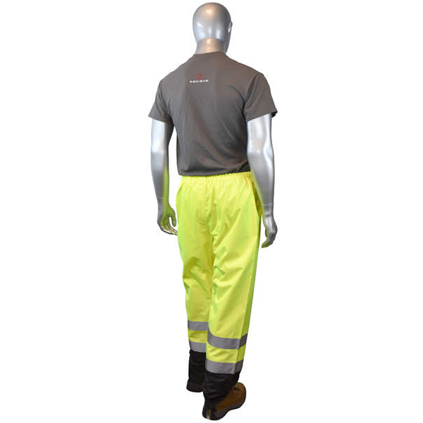 RadWear Sealed Waterproof Safety Pants come with an elastic waist with a drawstring to easily customize a comfortable fit. It also has slash pockets with pass-through access for convenience. It also features a color block bottom which helps in hiding dirt as you work through muddy or wet surfaces. These Type R, Class E, ANSI-rated safety pants also come with two inches of silver reflective tape (2 horizontal stripes on both legs). This helps enhance visibility when working in low light conditions during gloomy weather, heavy downpours, or late night or early morning shifts.