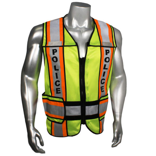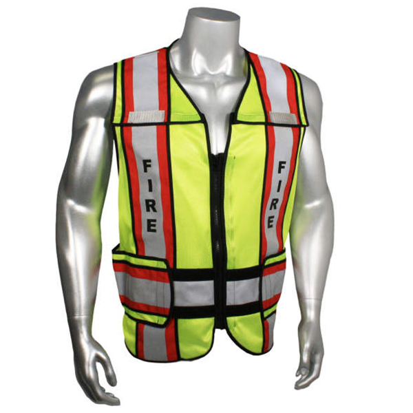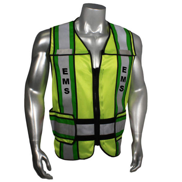 Radwear USA LHV-207-4C Safety Vest is made from durable and breathable hi-vis green polyester mesh. It also features a 3M Scotchlite reflective tape to boost visibility and protect from hi-viz hazards when working in low light conditions. The front and back printed name identification in bold letters also allows for easy recognition while on the field. The silver reflective tapes are even fixed against 4 inches of contrasting trim – blue or orange for Police, green trim for EMS, and red trim for Fire.