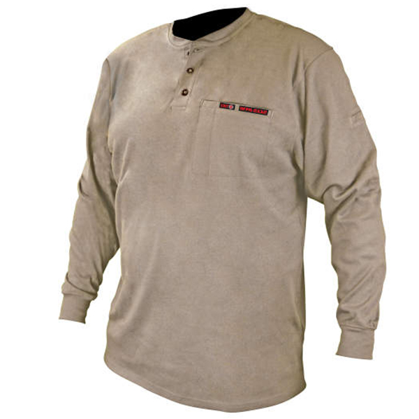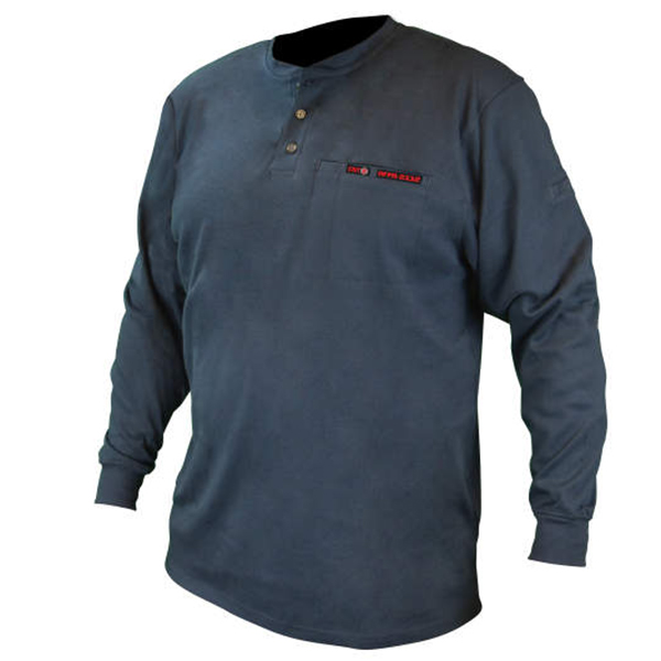 VolCore Long Sleeve Cotton Henley FR Shirt is made from a 6.5 oz 100% Cotton Interlock Knit which self-extinguishes and does not melt when exposed to flame. It features a banded collar with a 3-button front opening to allow for easy donning and doffing and for air circulation, too, when job condition gets heated up. It also has elastic sleeve cuffs to securely keep it in place, prevent it from rolling up, and keep any debris from entering the sleeve opening. It also has a left chest pocket with a pencil slot and a dual pen pocket as well on the upper left sleeve.