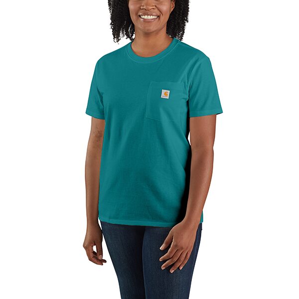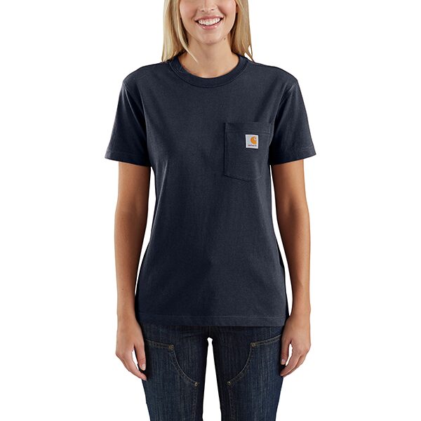 Stay comfortable and stylish during your work hours with Carhartt Womens SS Pocket T-Shirt. Crafted from sturdy heavyweight cotton to keep you at ease throughout the day. It comes with a rib-knit crewneck that holds its shape like a champ, a handy left-chest pocket for your essentials, and a tagless neck label for that extra smooth feel.